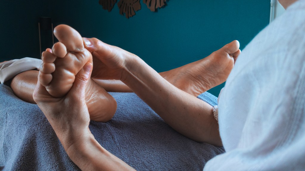 Elle consiste à stimuler des points réflexes au niveau des pieds et agit en « réaction miroir » du corps lorsqu’on stimule telle ou telle zone correspondant à tel ou tel organe. Le réflexe part d’un récepteur périphérique qui est en général la peau, puis l’impulsion nerveuse va cheminer le long d’un trajet faisant intervenir le cerveau. La réponse peut être hormonale, ou une contraction ou décontraction musculaire, la stimulation d’une fonction etc…